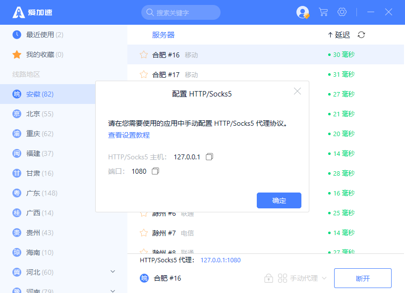 3、获得爱加速代理的主机号和端口号: